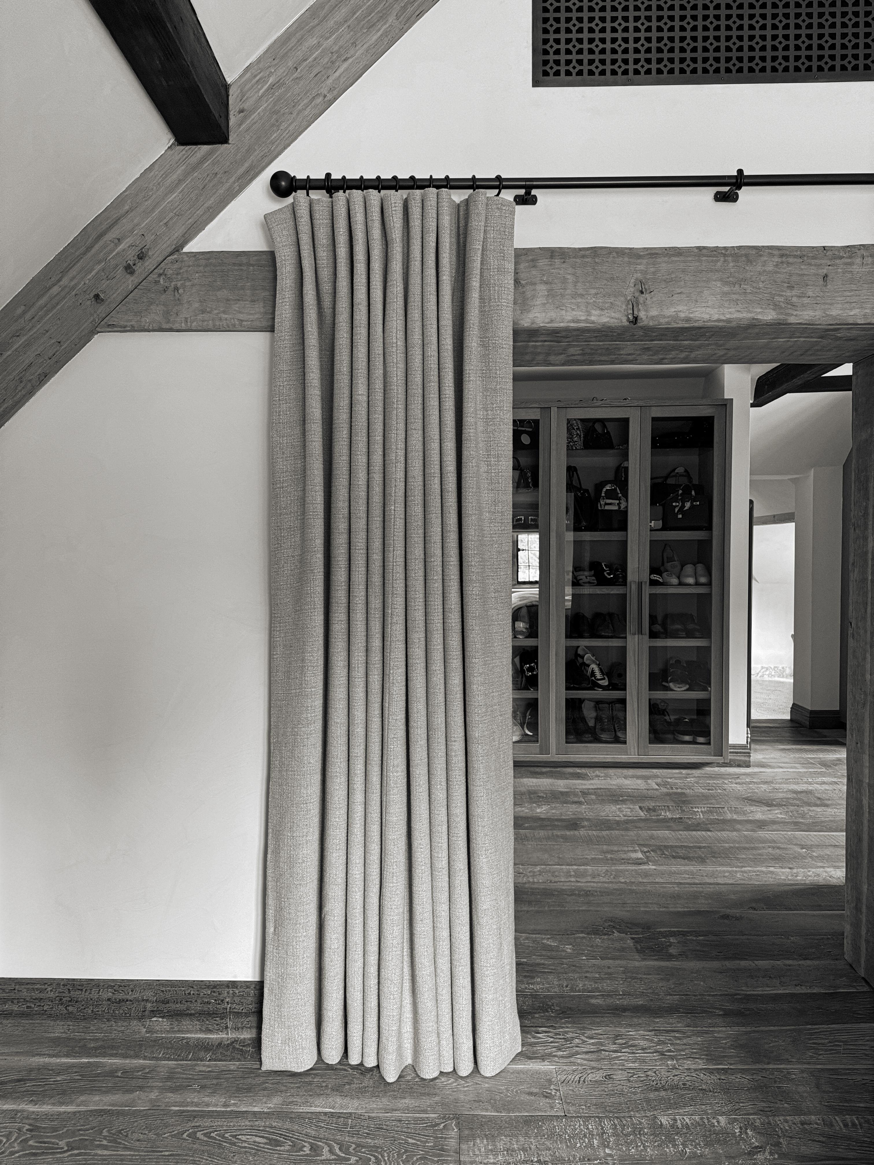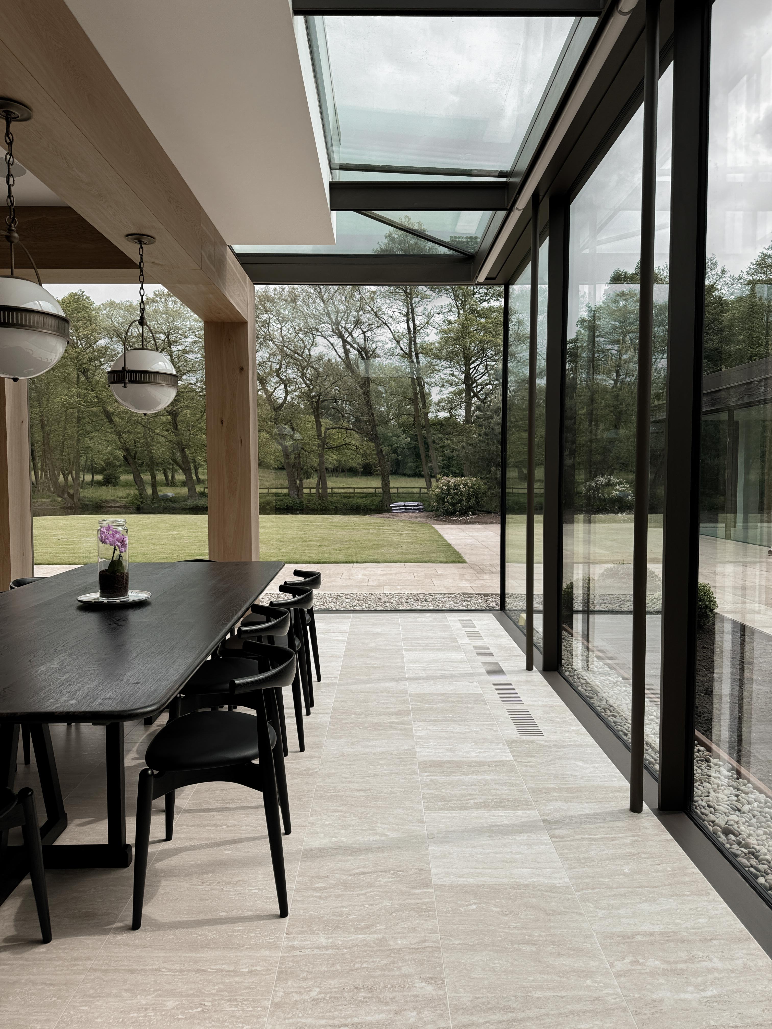 Appointed in 2019, our scope included the interiors of the main house and barn, plus two new rear extensions: a kitchen and pantry, and a leisure wing with pool, gym, and spa. Linked by finely detailed glass connections, these additions create a subtle dialogue between historic and contemporary architecture.